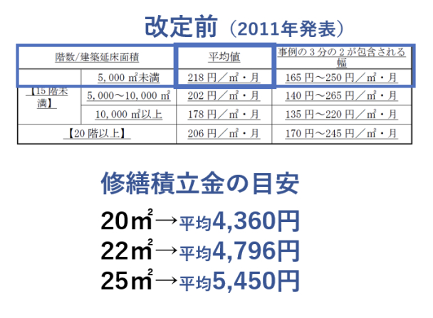 (期間全体での修繕積立金の平均額の算出方法)実は毎月の修繕積立金は、国土交通省から適正金額が発表されており、2021年に10年ぶりに改正されています。 国土交通省が発表した積立金の平均値は335円/㎡・月 です。これはあくまで目安程度ではありますが、 一つの指標として参考になると思います。ただし、総戸数が少なければ少ないほど、この金額は上がる傾向にあるので、 注意してください。 総戸数20戸前後の場合、月々の修繕積立金が既に平均額以上(20㎡の場合6,700円以上) に上がっている物件だけを選ぶなど、リスクヘッジが必要になってきます。